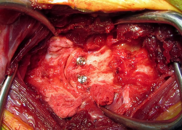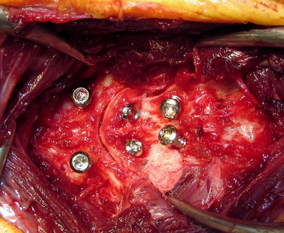 ![]() 環椎軸椎関節軟骨に上腕骨から採取した海綿骨移植を行います。 |